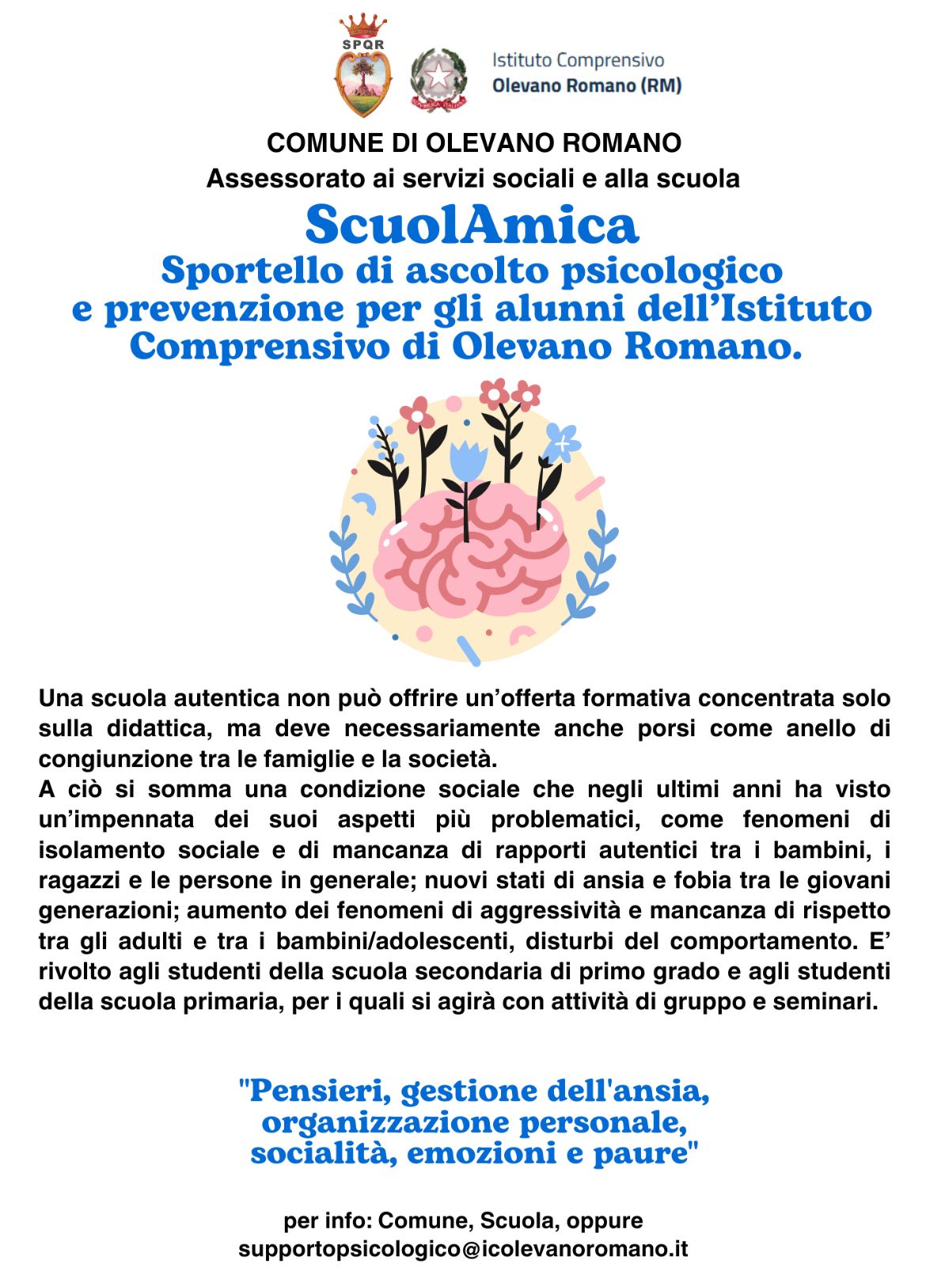 Sportello di ascolto psicologico e prevenzione per gli alunni dell'Istituto Comprensivo di Olevano Romano.